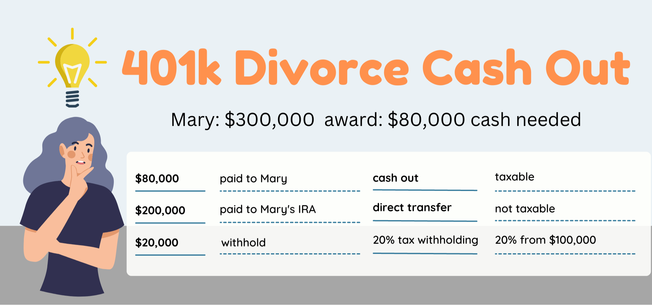 👉 MISTAKE#2:Not considering 20% withholding when splitting 401k in a divorce (applicable when payment is to a person, either cashing out or a rollover).